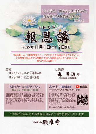 11月1日~2日、彦根市の願乗寺の報恩講法要に出講。15年前の永代経法要に続いて2度目のご縁。住職は本山でIT関連部署に在籍していたという。左記のような美しいチラシも簡単に作ることができるようだ。