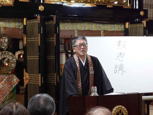 10月25日(土)~26日(日)嚴浄寺の報恩講法要を勤修した。甲賀組内の法中は25日(土)初夜の法座に参勤してくださり、後継住職の北村さんも加わり、内陣は久しぶりに8名が入る賑やかなお勤めとなった。ご講師は、近江八幡市金照寺住職で布教使の西川至師だった。